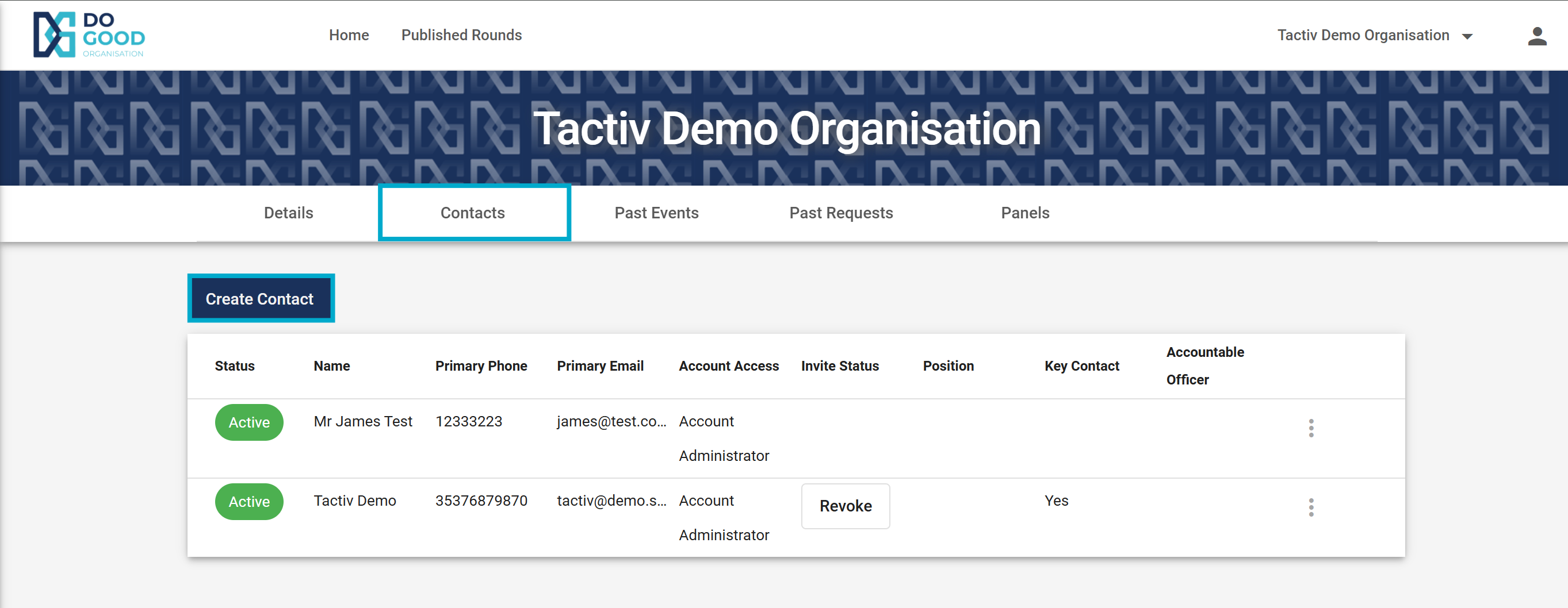 2. Navigate to the Contacts tab to see the list of existing contacts, then select Create Contact.