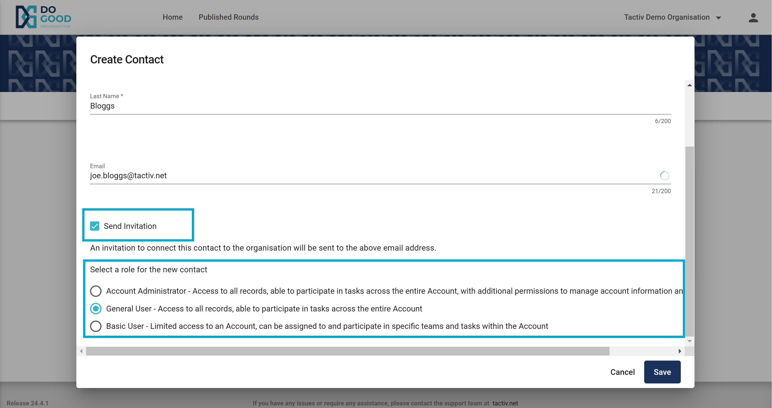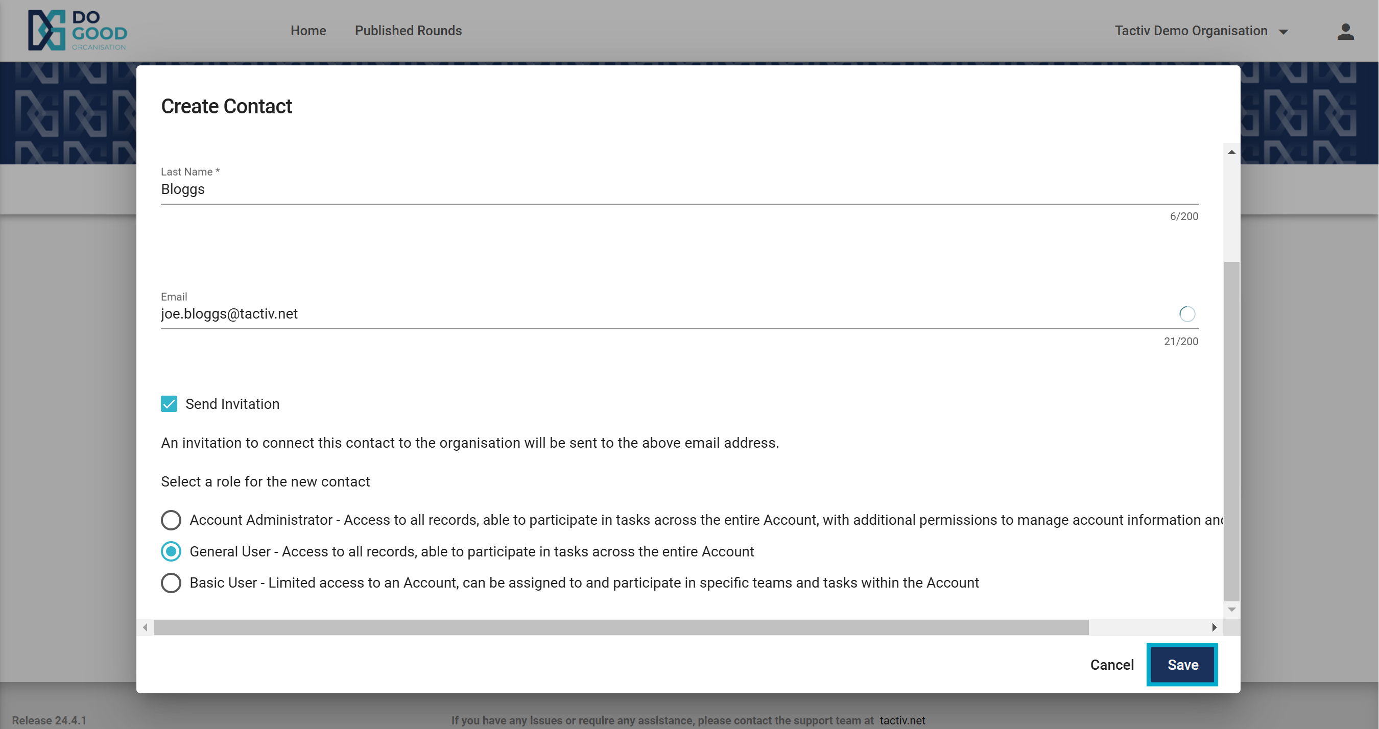4. Once you have completed the form and are ready to invite the contact, select Save.